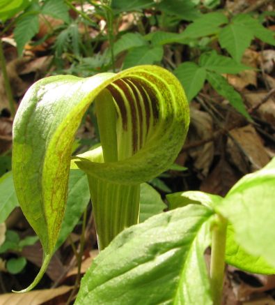 One bad thing about getting intimate with jack in the pulpit is who they associate with...a lot of poison ivy. (bad company is dark green leaves in background of above photo)
